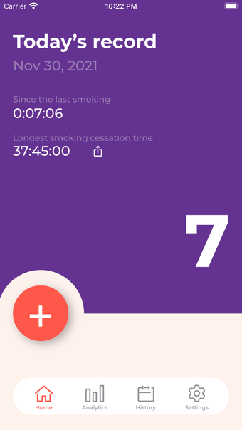 تعرض شاشة "التاريخ" عرض تقويمي لأوقات التدخين ، مما يتيح للمستخدمين حذف السجلات بنقرة واحدة. في قسم "الإعدادات" ، يمكن للمستخدمين تخصيص يوم بدء الأسبوع على التقويم. تقدم النسخة المجانية أسبوعًا واحدًا من بيانات التدخين ، بينما تفتح النسخة Pro ، المتاحة من خلال عملية الشراء داخل التطبيق ، تسجيلات غير محدودة وإحصاءات شهرية وسنوية مفصلة.